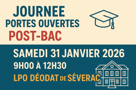 Post-bac : samedi 31 janvier 2026 de 9h00 à 12h30 (l'entrée des visiteurs sera autorisée jusqu'à 12H00)