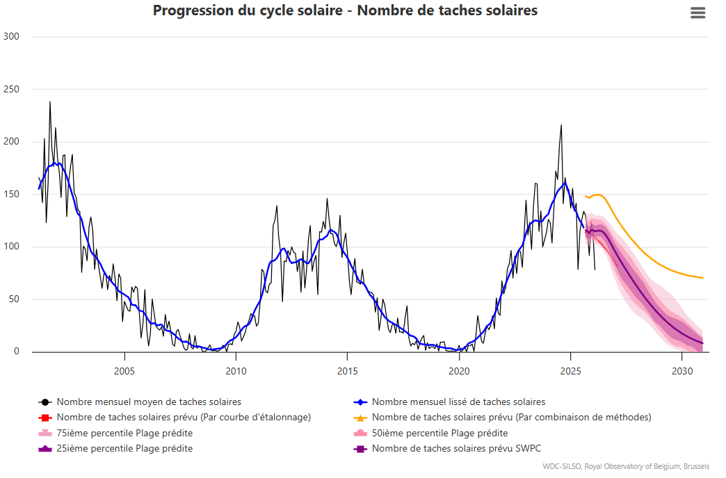 Le cycle actuel, appelé cycle solaire 25, a commencé vers 2020. D’après les observations scientifiques et les graphiques d’évolution du nombre de taches solaires, le maximum semble avoir eu lieu autour de 2024-2025. Depuis, l’activité commence lentement à diminuer, mais elle reste encore importante.