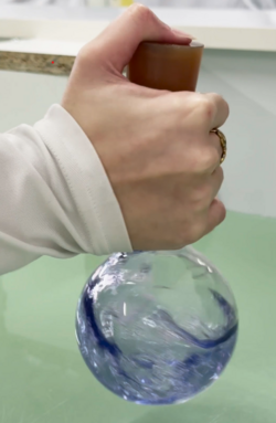 Au début, le liquide est transparent. Quand on secoue la bouteille, il devient bleu. Quand on laisse la bouteille au repos, il redevient transparent. On peut recommencer plusieurs fois.
