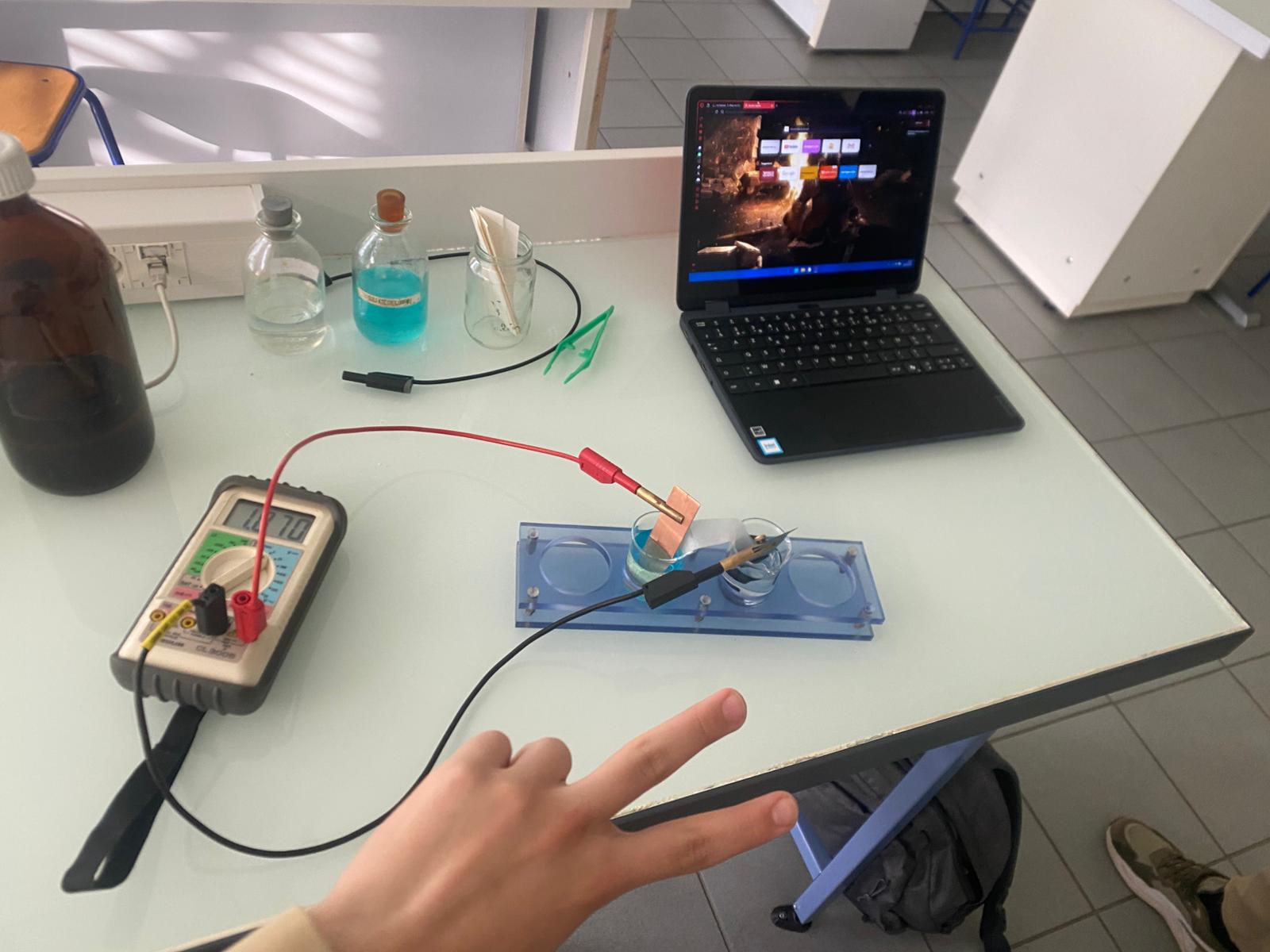 Pour réaliser cette expérience, nous avons utilisé le sulfate de zinc et sulfate de cuivre qui remplacent le jus de citron, une lamelle en zinc, une lamelle en cuivre, des fils électriques et un multimètre permettant de mesurer la tension électrique produite.