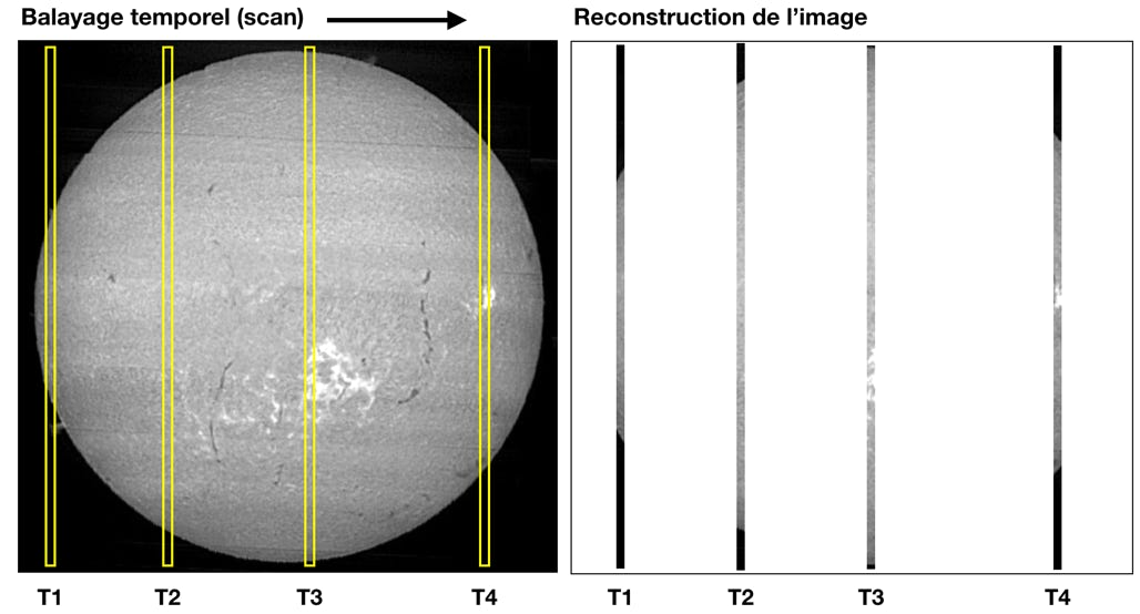 Fonctionnement en « scanner » : Le disque solaire défile devant la fente → reconstruction d’une image 2D par balayage.